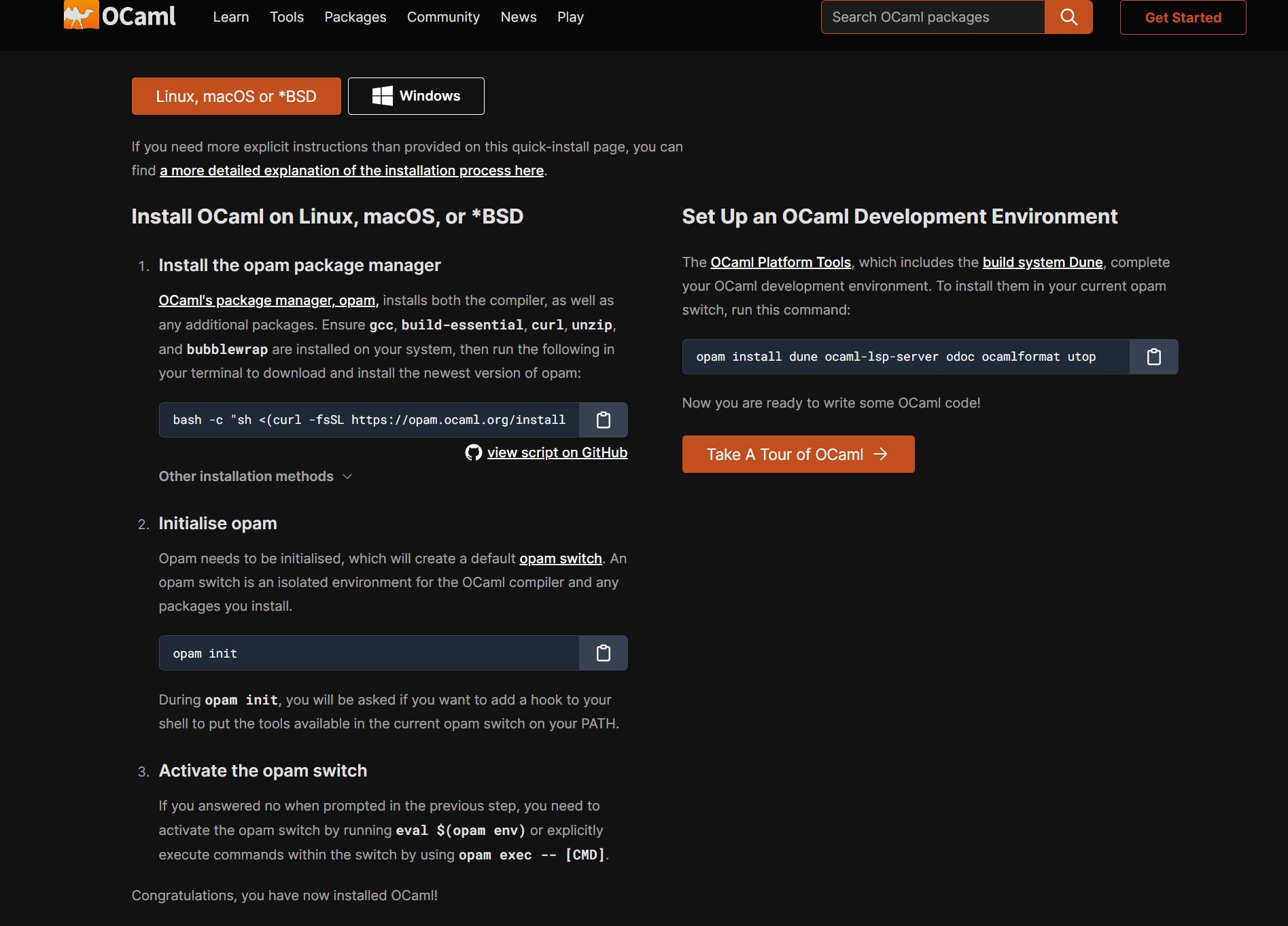 opam install dune ocaml-lsp-server odoc ocamlformat utop