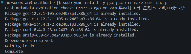 gcc, build-essential, curl, unzip, bubblewrap, gmp-devel安装指令依然是yum或dnf,因此与apt下安装存在一些不同: